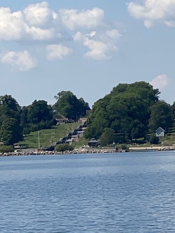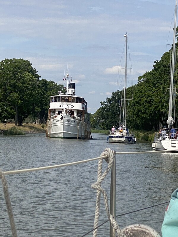 Am 21. Juli 25 hieß es 9 Brücken und eine Schleuse zu passieren. In Borgenberg hatten wir für eine Mittagspause festgemacht. Hier gibt es das gut erhaltene Göta – Hotel, außerdem kann die M/S Juno und die M/S Wilhem Tham entgegen. Anschließend sind wir noch 20 Minuten weiter gefahren, um auf dem Borensee zu ankern. Tags darauf fuhren wir zur zweiten großen Schleusentreppe (5 Schleusen), wo wir mangels genügend Anlegestellen erst einmal auf dem See warten mussten. Auch hier hat die Berufsschifffahrt Vorrang und wir mussten zwei Fahrgastschiffe passieren lassen. Nach 4 Stunden hatten wir die 5 Schleusen und ca. 8 sm geschafft und konnten in Motala anlegen.